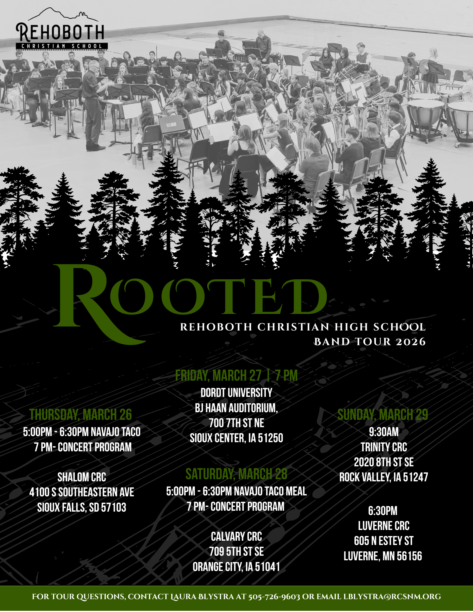 The Rehoboth Christian High School band invites you to attend their concerts while they are touring in your local area.