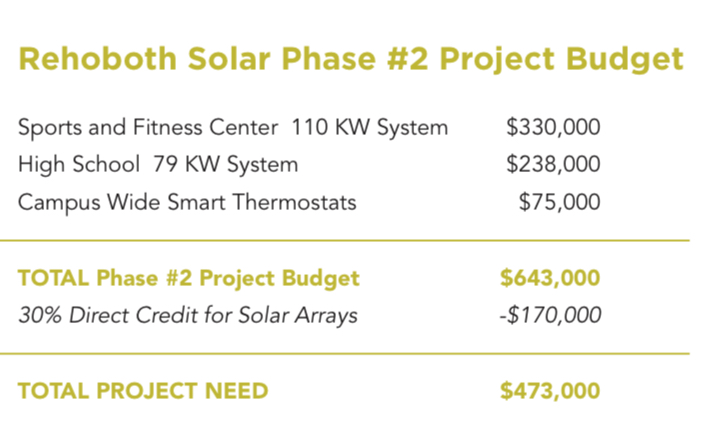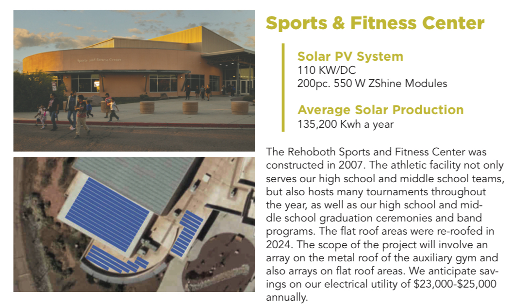 The Rehoboth Sports and Fitness Center was constructed in 2007. The athletic facility not only serves our high school and middle school teams, but also hosts many tournaments throughout the year, as well as our high school and middle school graduation ceremonies and band programs. The flat roof areas were re-roofed in 2024. The scope of the project will involve an array on the metal roof of the auxiliary gym and also arrays on flat roof areas. We anticipate savings on our electrical utility of $23,000-$25,000 annually.